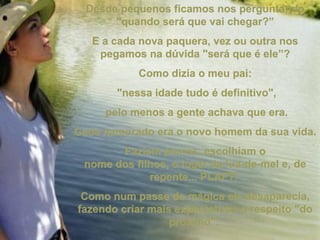 O documento descreve as etapas do amadurecimento e da busca pelo amor ao longo da vida. Ele discute como as prioridades e expectativas mudam com a idade, desde os primeiros namoros na juventude até aprender a se amar e atrair alguém que também goste da gente. No final, entende-se que a chave para a felicidade está em primeiro se amar a si mesmo.