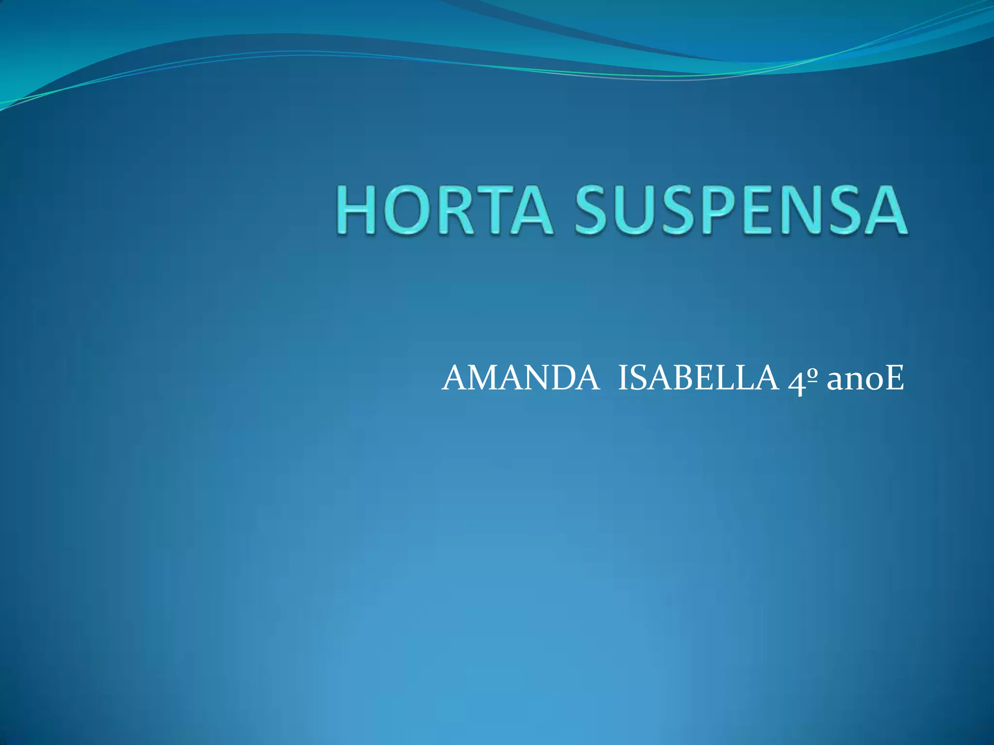 Este documento descreve como criar uma horta suspensa, incluindo o que pode ser plantado nela, como alface e outros vegetais e ervas, e os materiais necessários, como garrafas PET, isopor e terra. A conclusão enfatiza a importância de cuidar bem das plantas para que não morram.