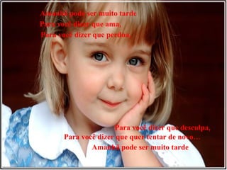 O documento alerta que amanhã pode ser tarde demais para expressar sentimentos como amor, perdão e arrependimento. Recomenda-se não deixar para amanhã dizer "Eu amo você", "Estou com saudades", "Perdoe-me", ou fazer gestos de carinho, pois amanhã a outra pessoa pode já não estar disponível ou disposta a ouvir.