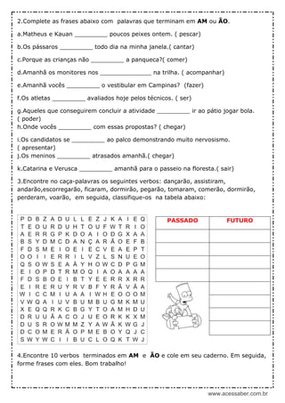 O documento ensina sobre o uso dos verbos no passado (terminados em AM) e no futuro (terminados em ÃO). Contém exercícios de preenchimento e formação de frases com verbos no passado e futuro.
