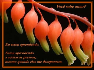 O documento descreve a jornada de aprendizado do autor em aceitar as pessoas como elas são, escutar além das palavras, e amar incondicionalmente. O autor reconhece que é difícil, mas está aprendendo a perdoar e ver o valor em cada vida.