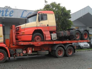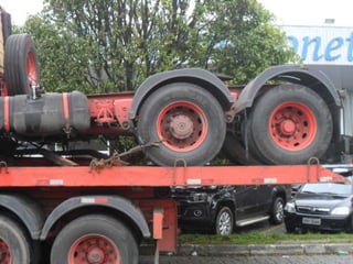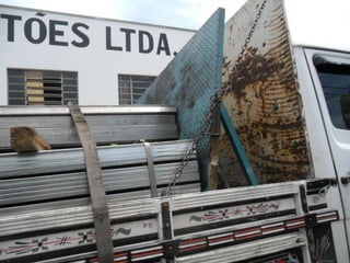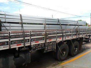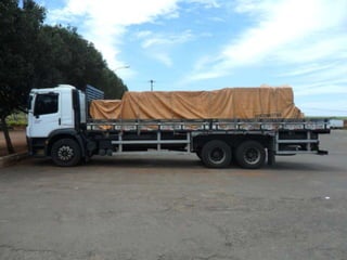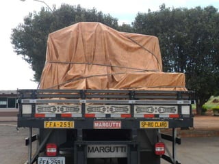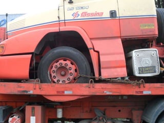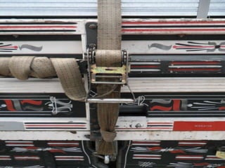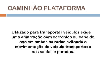 O documento discute as amarrações de cargas em diferentes tipos de caminhões, incluindo prender as rodas de veículos com correntes em caminhões plataforma, amarrar produtos de forma específica em caminhões com carroceria de madeira, e usar cintas de lona e catracas para fixar matérias-primas em caminhões com carroceria e proteção na cabine.