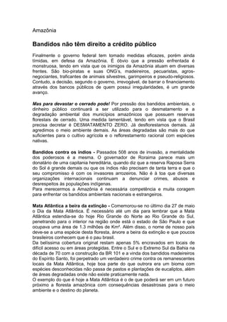 O documento discute a proteção da Amazônia e da Mata Atlântica contra os "bandidos ambientais" que promovem o desmatamento ilegal. Defende medidas mais rígidas contra aqueles que recebem financiamento público para degradar o meio ambiente e pede competência e coragem para enfrentar os inimigos da preservação ambiental.