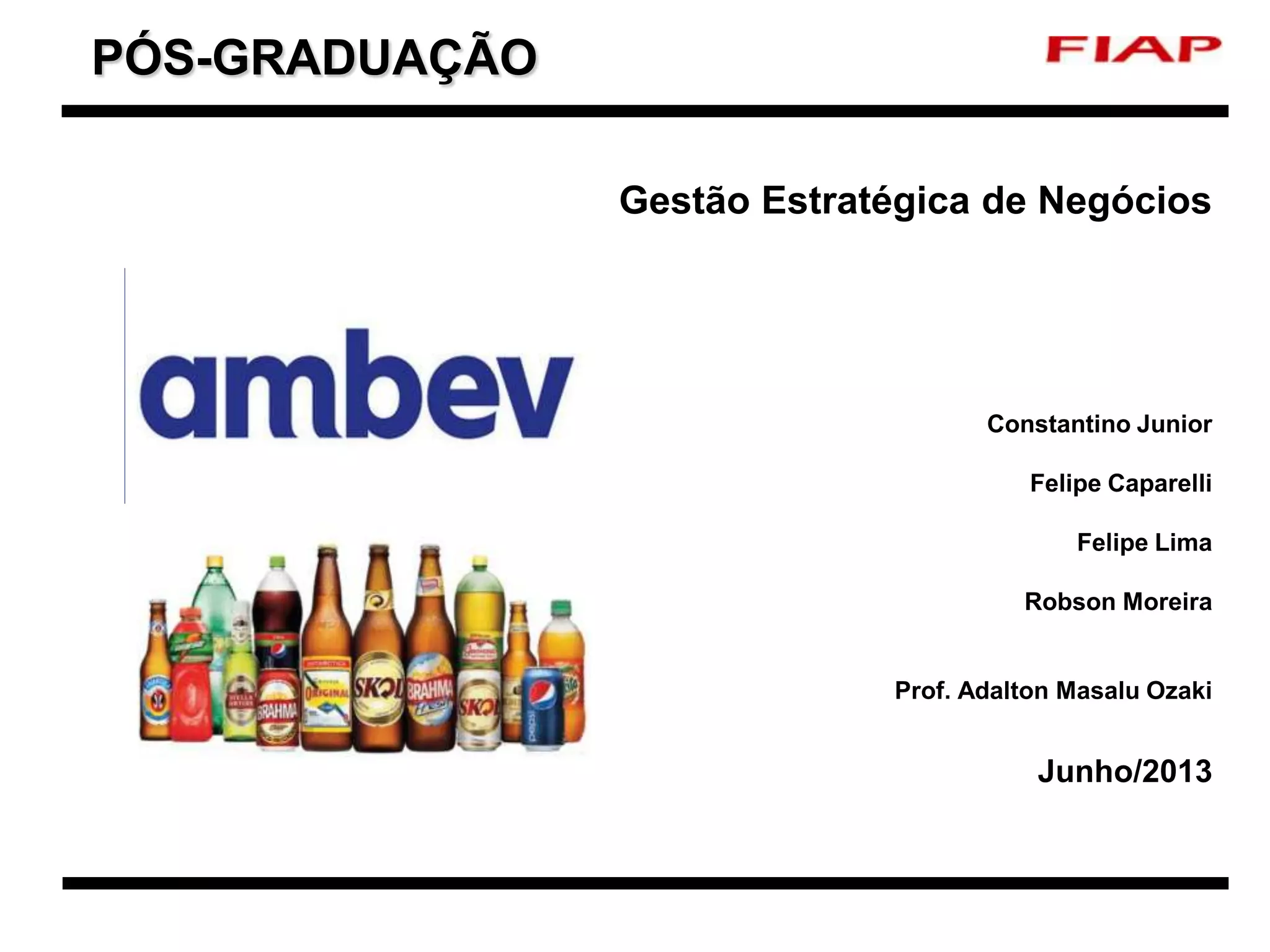 O documento analisa a trajetória da Ambev desde sua fusão em 1999, destacando sua ascensão como líder de mercado e suas estratégias de expansão através de aquisições e parcerias. A análise financeira evidencia o crescimento significativo da empresa, enquanto as forças competitivas revelam um ambiente de alta rivalidade e um forte poder de negociação dos consumidores. Conclui-se que a experiência gerencial e as estratégias de mercado, incluindo a inovação e sustentabilidade, são essenciais para a continuidade do sucesso da Ambev.