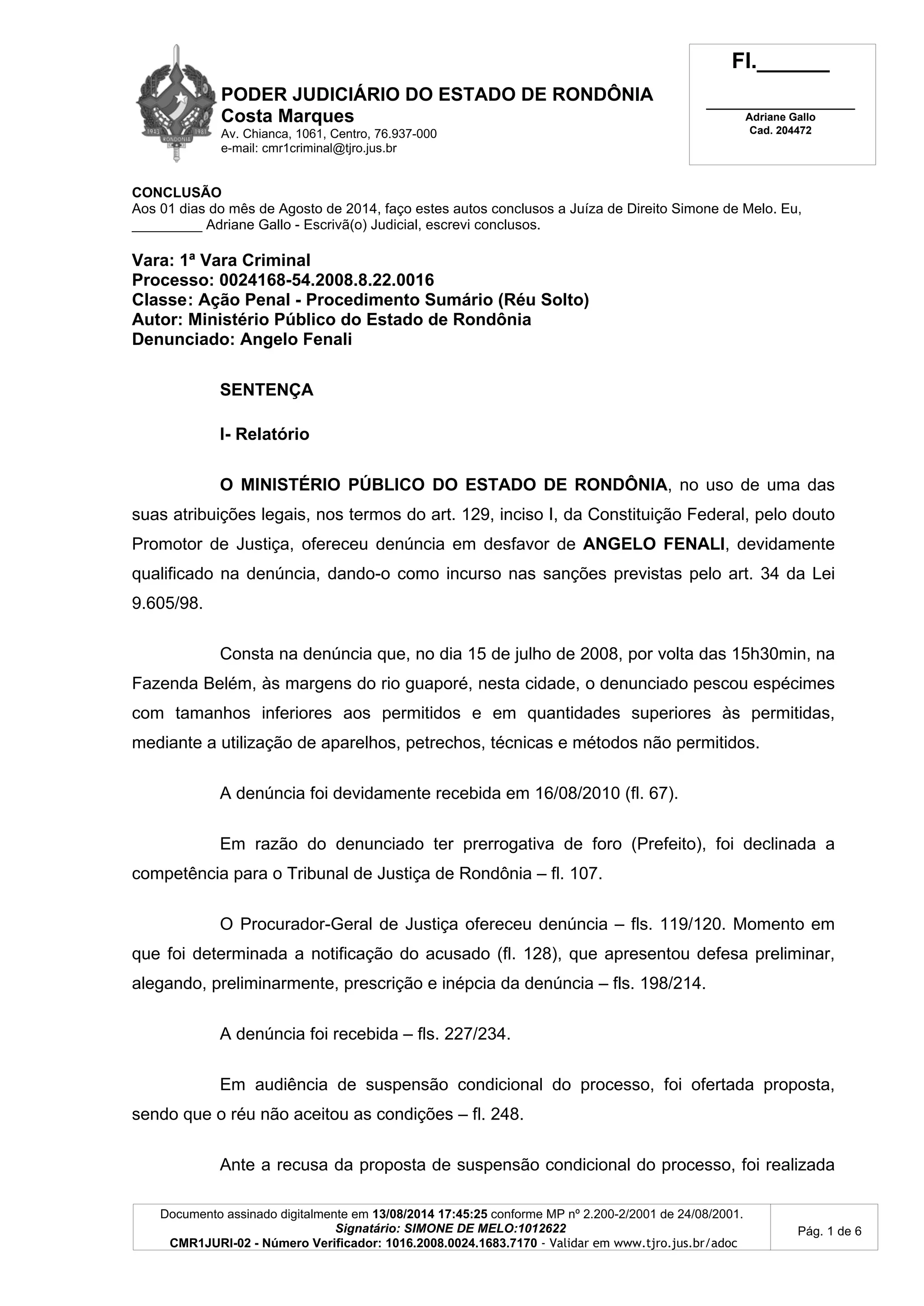 O documento é uma sentença judicial que condena Angelo Fenali por crime ambiental de pesca ilegal. A sentença relata que Fenali foi denunciado por pescar acima do limite permitido e com tamanhos de peixes abaixo do permitido, usando equipamentos proibidos. Apesar de Fenali negar as acusações, as provas dos autos, incluindo depoimentos de testemunhas, confirmam os fatos narrados na denúncia. Assim, o réu é condenado a 1 ano de detenção em regime aberto, substituída