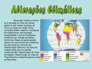Este documento discute as alterações climáticas e as medidas para combatê-las. Aborda os tipos de classificação do clima, as causas das alterações como o aumento da temperatura média da Terra, e medidas como a redução de gases de efeito estufa através do Protocolo de Quioto. Também descreve formas de poluição como dos solos, das águas e da atmosfera, e soluções como a reciclagem. Lista ainda os dez países que mais poluem o planeta.
