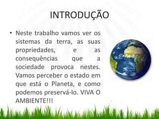 INTRODUÇÃONeste trabalho vamosver os sistemas da terra, as suas propriedades, e as consequências que a sociedade provoca nestes. Vamos perceber o estado em que está o Planeta, e como podemos preservá-lo. VIVA O AMBIENTE!!!