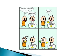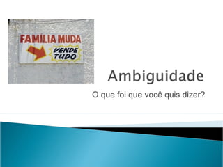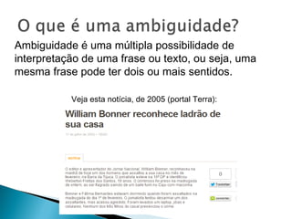 Este documento discute o conceito de ambiguidade, que é quando uma frase ou texto pode ter múltiplos significados. Ele fornece exemplos de frases ambíguas e como desfazer a ambiguidade reescrevendo as frases. Também observa que a ambiguidade às vezes é inserida intencionalmente em anúncios, poemas e textos literários para criar um efeito.