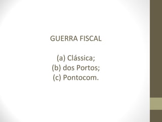 O documento aborda a guerra fiscal dos portos e do comércio eletrônico, discutindo a concessão de benefícios que favorecem importações e a consequente alteração das alíquotas do ICMS. A resolução do Senado Federal de 2012 visa mitigar a guerra dos portos, definindo alíquotas diferenciadas para diversos produtos importados. A análise também inclui os limites da competência legislativa e questões relacionadas à legislação federal sobre comércio exterior.