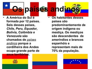 A América do Sul é formada por 12 países. Seis países andinos - Chile, Peru, Equador, Bolívia, Colômbia e Venezuela - têm a cordilheira dos Andes em seus territórios e economias baseadas em agricultura, mineração e petróleo. Argentina, Paraguai e Uruguai formam a região platina e têm economias agropecuárias. O Brasil é o maior país da América do Sul e uma potência regional.