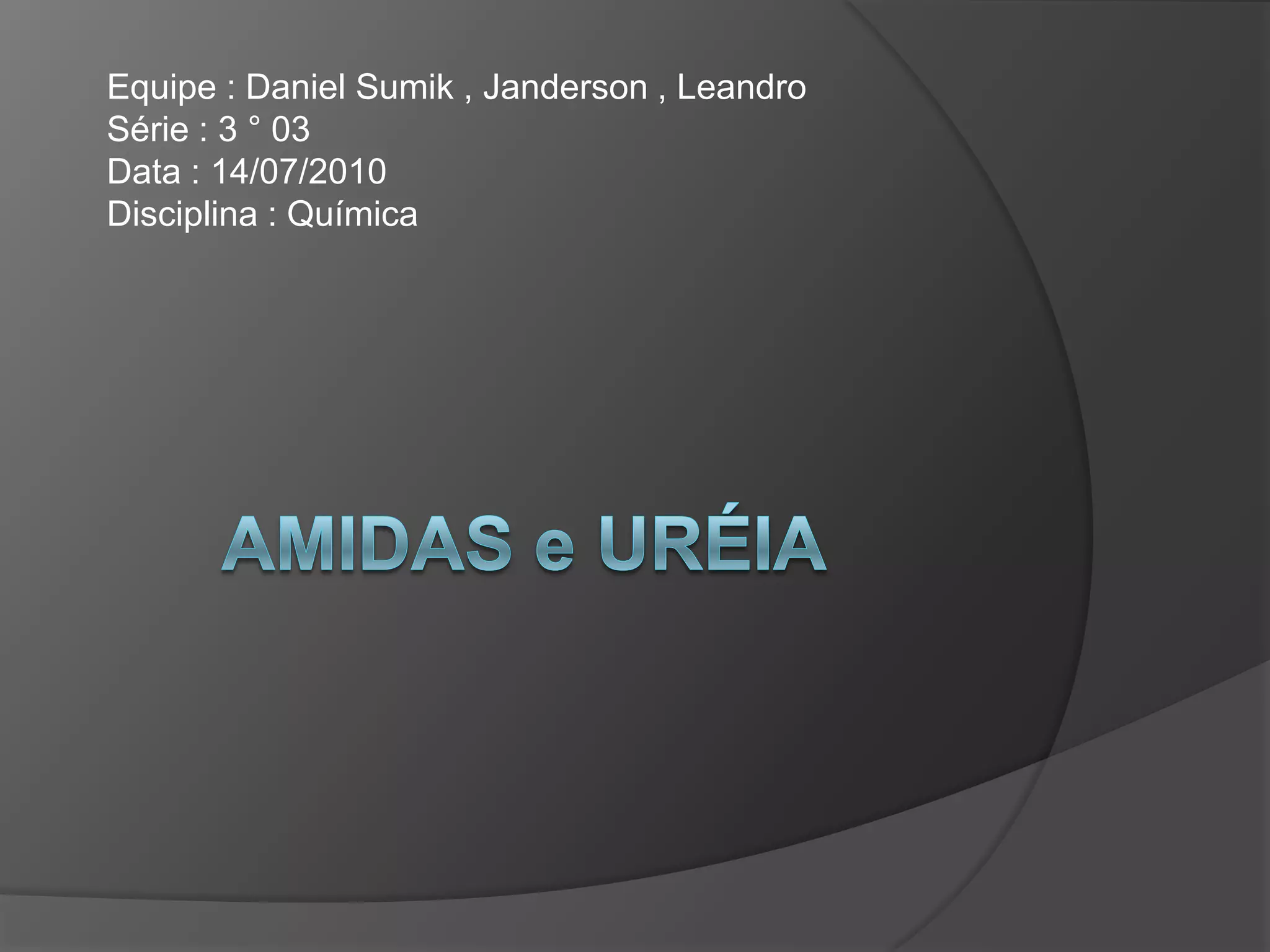 O documento descreve as propriedades de amidas e ureia. As amidas são compostos orgânicos derivados de ácidos carboxílicos onde o grupo -OH é substituído por -NH2. Apresentam pontos de ebulição mais altos do que seus ácidos correspondentes devido à formação de ligações de hidrogênio. A ureia é um composto orgânico cristalino e incolor formado principalmente no fígado e eliminado na urina, constituindo o principal produto do metabolismo protéico.
