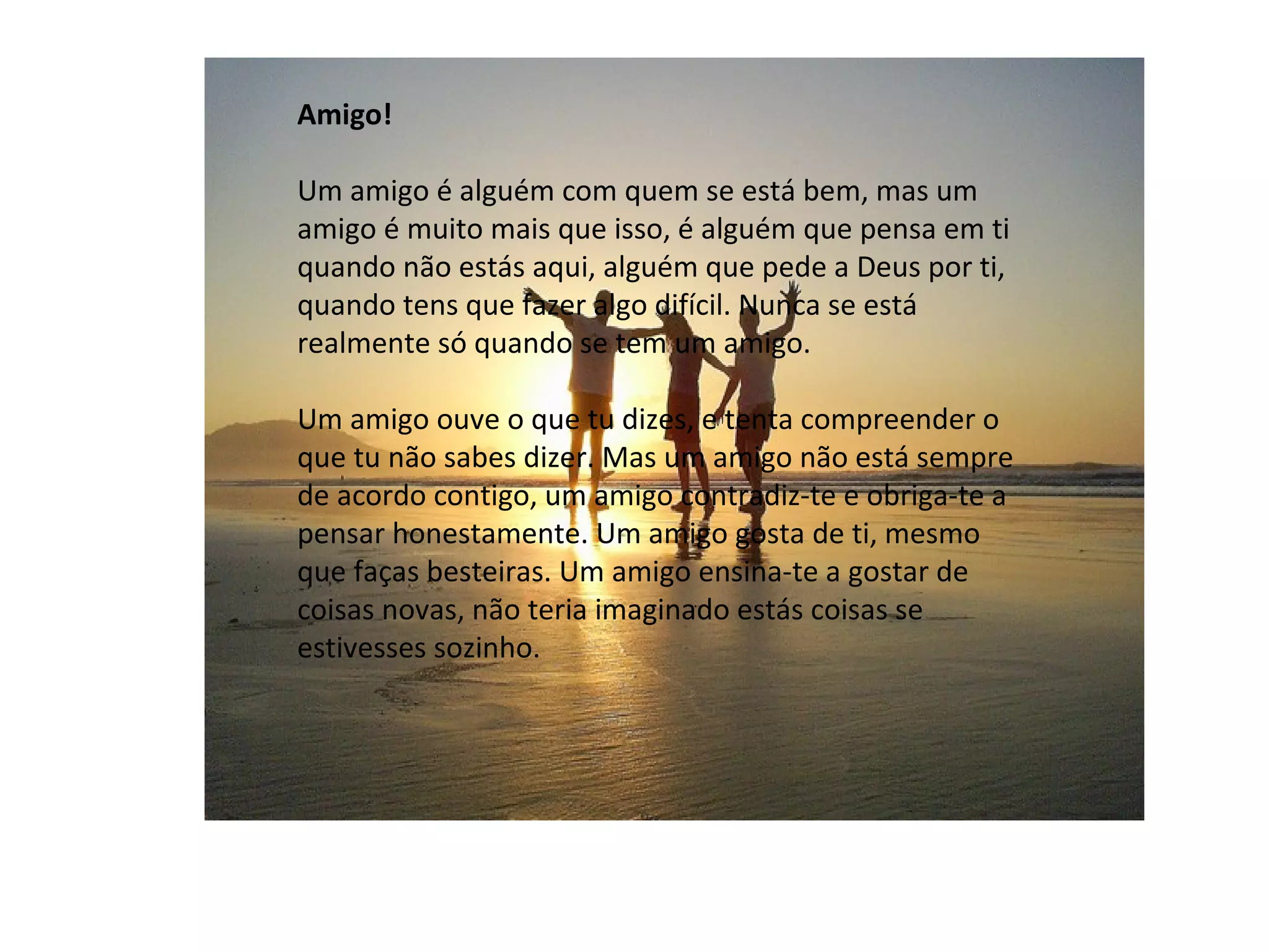 Um amigo é alguém que se preocupa e pensa em você mesmo quando não está por perto, que reza por você quando enfrenta desafios e que nunca deixa você se sentir sozinho. Um amigo ouve você e tenta entender seus sentimentos, mesmo quando você não consegue expressá-los, e também está disposto a discordar de você para te ajudar a pensar com mais clareza.