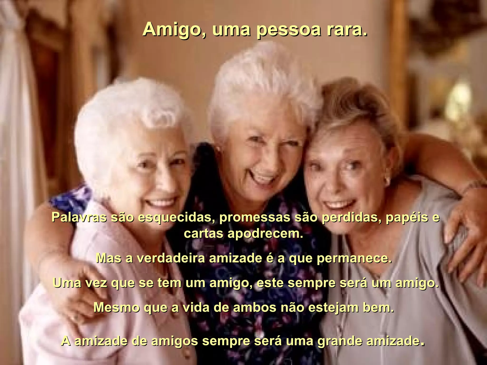 Amigo, uma pessoarara. Palavras são esquecidas, promessas são perdidas, papéis e cartas apodrecem. Mas a verdadeira amizade é a que permanece. Uma vez que se tem um amigo, este sempre será um amigo. Mesmo que a vida de ambos não estejam bem. A amizade de amigos sempre será uma grande amizade .