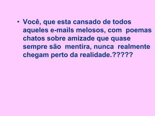 A carta descreve as ações que um "amigo de verdade" faria em diferentes situações, como ajudar com vingança quando a pessoa estiver triste, explicar as coisas de forma simples quando a pessoa estiver confusa, e rir quando a pessoa cair. A carta termina afirmando que um amigo de verdade não separa brigas, mas sim chega dando voadora.