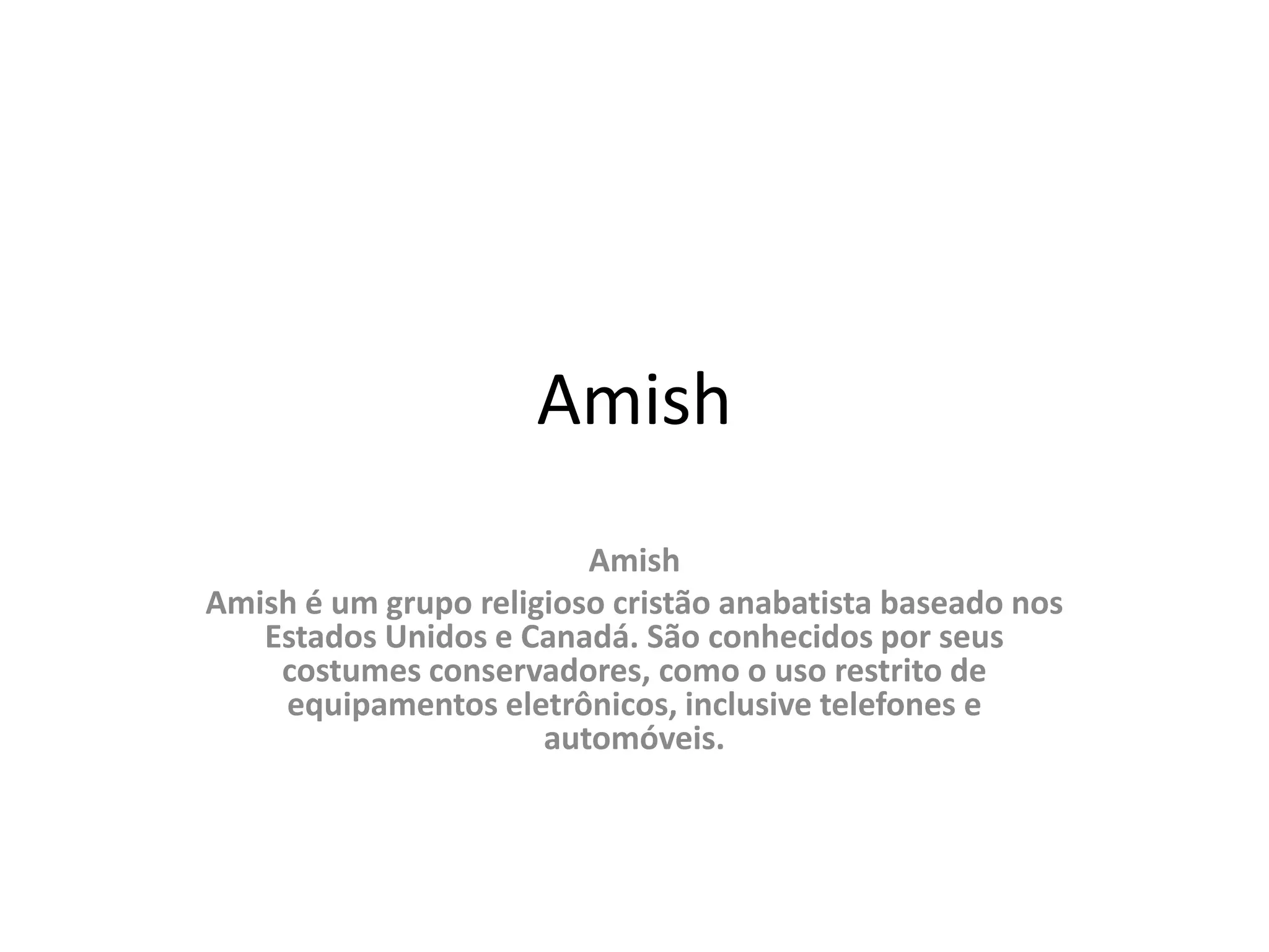 Os Amish são um grupo religioso cristão anabatista conservador baseado nos EUA e Canadá, conhecidos por seu estilo de vida simples e rejeição da tecnologia moderna. Eles surgiram na Suíça no século 17 e hoje vivem em comunidades agrícolas, seguindo regras rígidas e rejeitando luxos.
