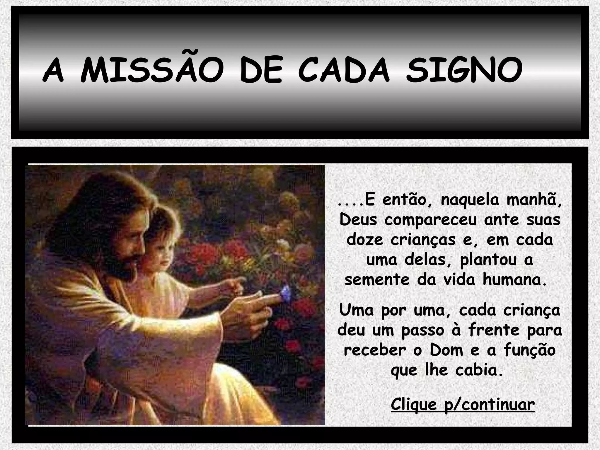 O documento descreve Deus atribuindo missões e dons a cada um dos doze signos do zodíaco. Cada signo recebe uma tarefa específica para ajudar na evolução humana e um dom correspondente à sua missão. No final, Deus pede que os doze signos se unam em um só para completar sua obra.
