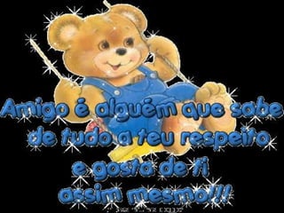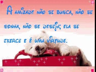 O documento discute a importância da amizade em nossas vidas, afirmando que a amizade gera felicidade, carinho e bons momentos. Também diz que só percebemos o verdadeiro valor da amizade quando a perdemos, e que um amigo é um tesouro mais valioso do que qualquer outra coisa.
