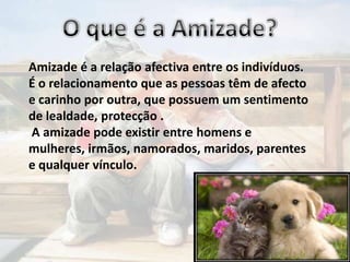 A amizade é a relação afetiva entre indivíduos baseada em afeto, carinho e lealdade. O amor verdadeiro é aquele que resiste a qualquer dificuldade e une o casal nos momentos ruins e alegres. A amizade pode existir entre diferentes tipos de relacionamentos como homens, mulheres, irmãos e parentes.