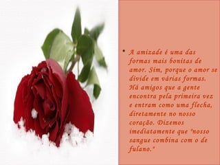 A amizade é uma forma de amor que pode ser encontrada de várias formas. Alguns amigos se conectam imediatamente enquanto outros precisam de tempo para conquistar um lugar em nossos corações. Amigos virtuais também podem se tornar importantes, embora alguns desapareçam com o tempo. No entanto, só é possível identificar os verdadeiros amigos durante os momentos difíceis, quando precisamos de apoio material ou emocional.
