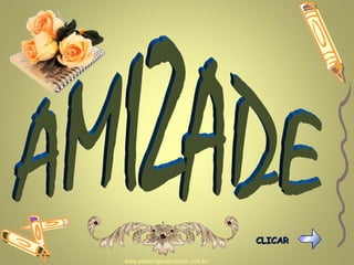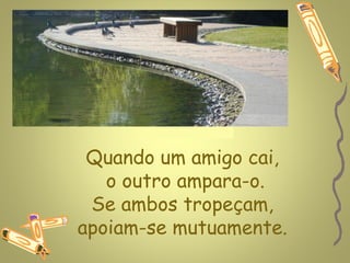 O documento é uma compilação de textos sobre amizade de insignes pensadores. Apresenta frases curtas sobre o tema da amizade, como o apoio mútuo entre amigos, a importância de abrir a porta para a amizade, e como os amigos percebem os sentimentos uns dos outros. A compilação é acompanhada por uma música e fotos para criar um ambiente positivo.