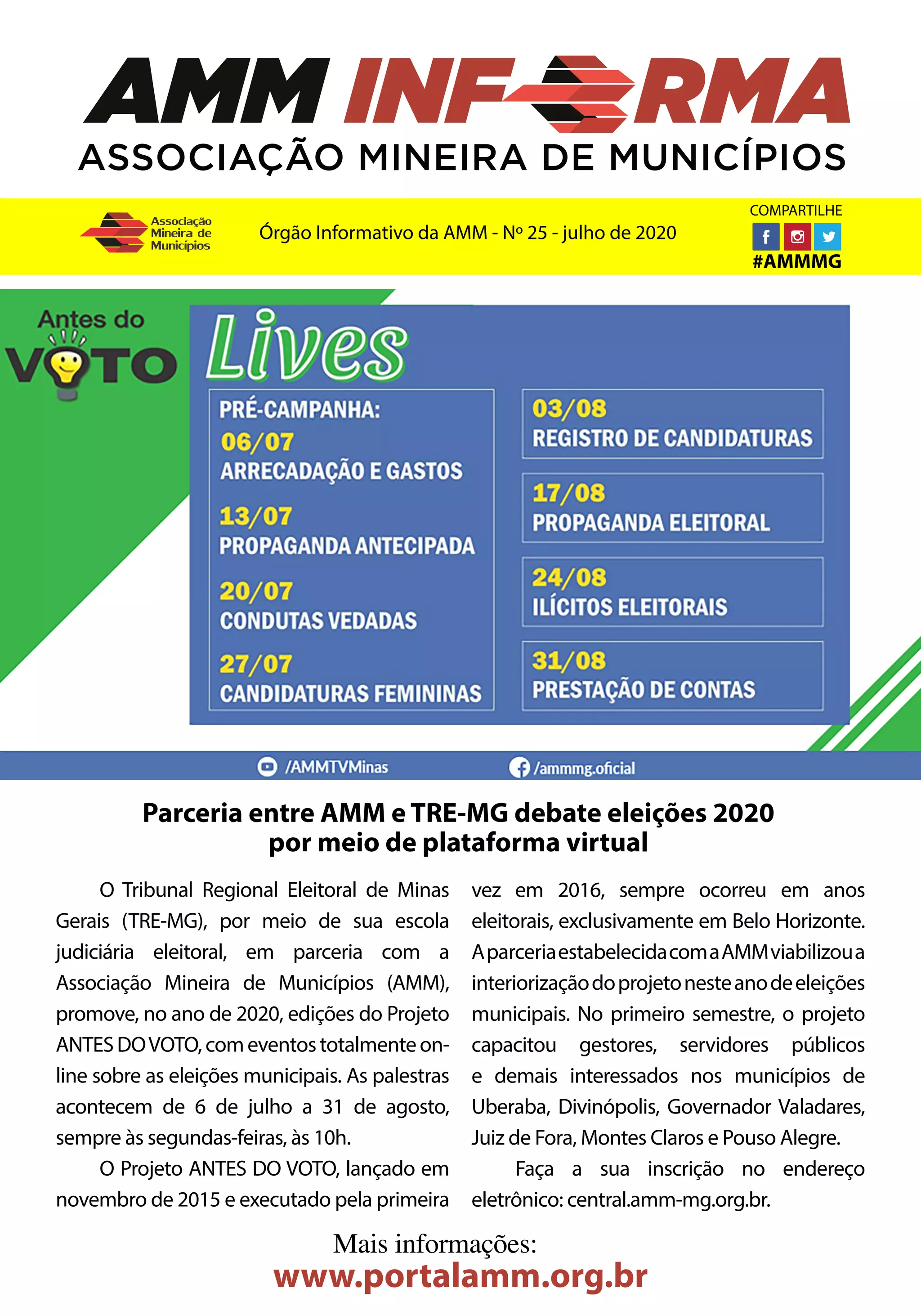 O documento discute uma parceria entre a Associação Mineira de Municípios (AMM) e o Tribunal Regional Eleitoral de Minas Gerais (TRE-MG) para realizar palestras online sobre as eleições municipais de 2020 por meio do projeto "ANTES DO VOTO". O projeto, lançado em 2015, normalmente ocorre em anos eleitorais em Belo Horizonte, mas a parceria com a AMM permitiu levar as palestras aos municípios mineiros neste ano de eleições municipais.