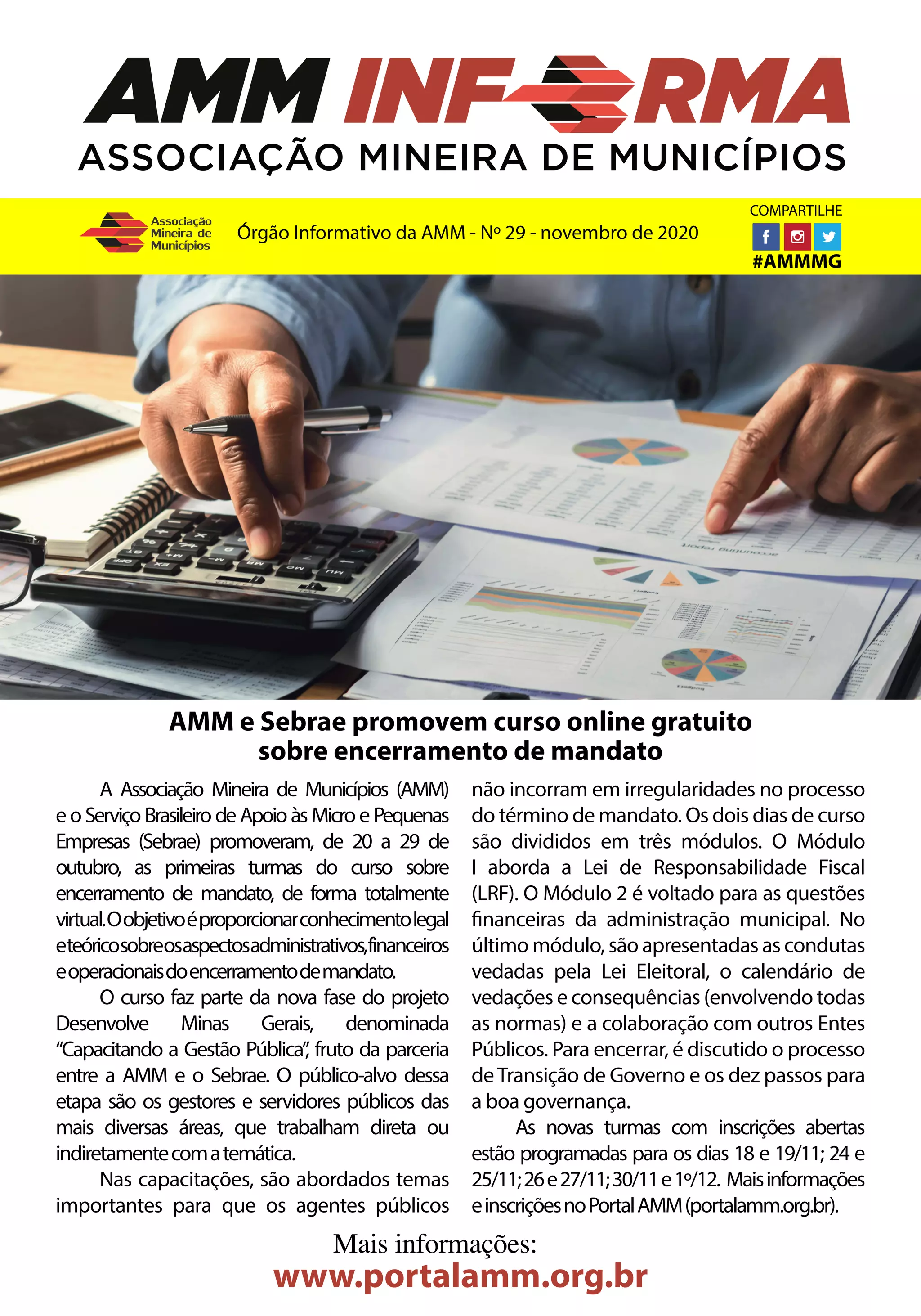 O documento descreve um curso online gratuito sobre encerramento de mandato promovido pela Associação Mineira de Municípios (AMM) e pelo Serviço Brasileiro de Apoio às Micro e Pequenas Empresas (Sebrae) para gestores e servidores públicos. O curso aborda temas legais e financeiros relacionados ao término do mandato para evitar irregularidades. Novas turmas do curso estão programadas para novembro e dezembro.