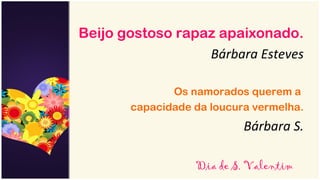 Poemas sobre amor e beijos escritos por alunos para o Dia de São Valentim, incluindo um sobre um rapaz que venceu o coração de uma rapariga com um beijo.
