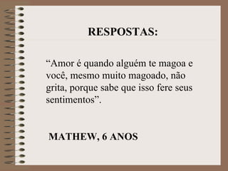 Este documento contém respostas de crianças entre 4 e 8 anos sobre o que é amor. As crianças descrevem amor como cuidar uns dos outros mesmo quando machucados, compartilhar comida sem esperar nada em troca, e apoiar em momentos difíceis. Uma criança também nota que amor é mais profundo entre pessoas que se conhecem há muito tempo.