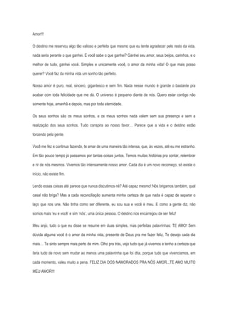 O documento é uma carta de amor para o parceiro, expressando o quão valioso é o amor que compartilham. O autor diz que ganhou o amor, beijos e carinho do parceiro, tornando sua vida um sonho perfeito. Ele também diz que nada pode acabar com a felicidade que o parceiro traz e que querem ficar juntos para sempre.