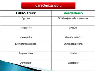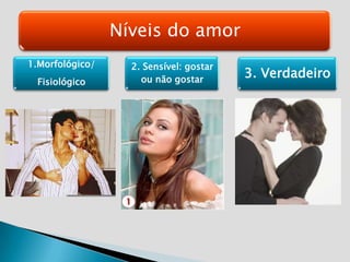A sexualidade humana abrange aspectos como afeto, comunicação e amor, sendo fundamental para a vida. O documento discute a diferença entre gostar e amar, enfatizando que amar envolve o desejo de felicidade do outro, enquanto gostar pode ser uma forma de posse egoísta. Questões sobre paixão e amor são abordadas, ressaltando que o amor transcende palavras e expressões.