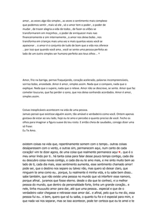 O documento descreve o amor como um sentimento poderoso capaz de trazer alegria e mudança positiva para as pessoas. Fala sobre como o amor nos deixa felizes e apaixonados, transformando-nos em crianças novamente. Também diz que o amor é o conjunto de tudo que há de bom na vida e que quando amamos, nos sentimos perfeitos ao lado de outra pessoa perfeita.