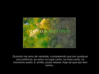 O documento discute os benefícios de amar a si mesmo verdadeiramente, incluindo relaxar e perceber que está no lugar certo, respeitar seus sentimentos e desejos internos, e viver no presente apreciando cada dia.