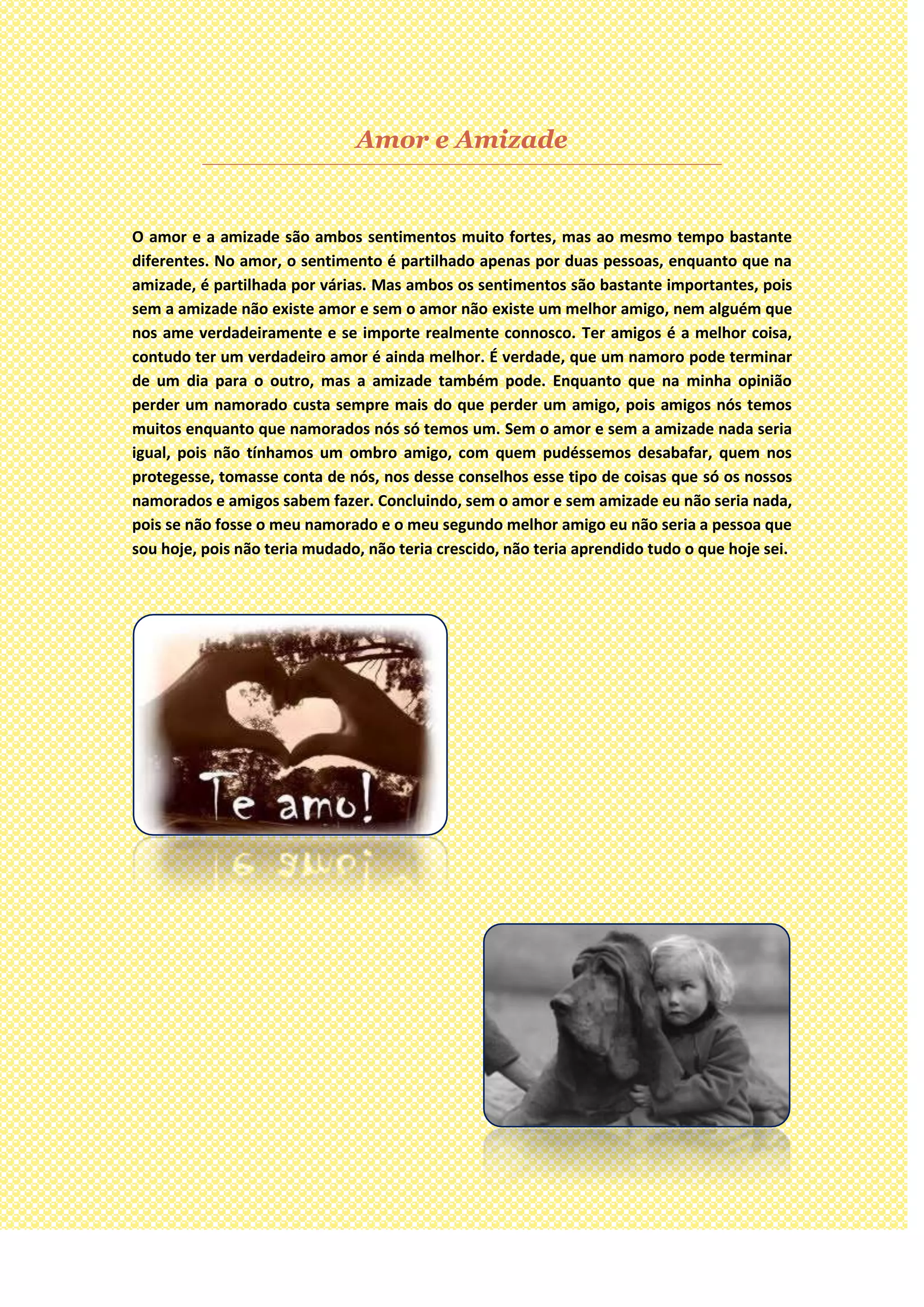 O documento discute a diferença entre amor e amizade, afirmando que o amor é compartilhado entre duas pessoas enquanto a amizade pode ser compartilhada por várias. Embora sejam sentimentos diferentes, ambos são importantes para o desenvolvimento pessoal e para nos sentirmos amados e apoiados.