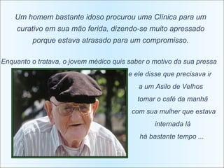 Um idoso procura um médico para um curativo em sua mão ferida, explicando que estava apressado para tomar café da manhã com sua esposa internada em um asilo que sofre de Alzheimer avançado. Quando o médico pergunta por que ele vai vê-la se ela não o reconhece, o idoso responde que embora ela não saiba quem ele é, ele sabe muito bem quem ela é.