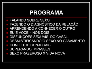 Este documento descreve um workshop sobre amor, sexualidade e afeto. O programa inclui discussões sobre sexo, diagnóstico da relação, conhecimento mútuo do casal, disfunções sexuais, conflitos conjugais e superação de impasses. O objetivo é fornecer informações e propor mudanças para uma vida mais feliz. Dois profissionais conduzirão o workshop abordando diversos tópicos como sexualidade feminina, masculina, efeitos da idade, doenças, medicamentos e tratamentos de disfunções.