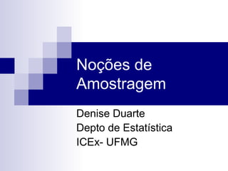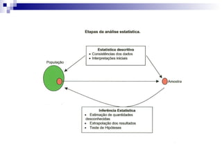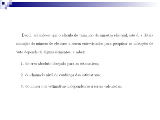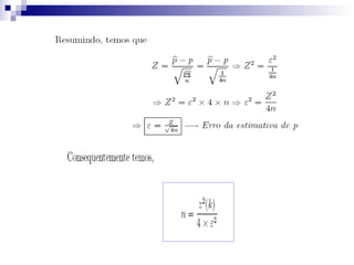 Este documento discute conceitos fundamentais de amostragem estatística, como população, amostra, censo, amostragem probabilística e não probabilística. Explica que uma amostra envolve estudar uma parcela da população, diferente de um censo que requer examinar todos os itens, e como calcular o tamanho adequado da amostra para estimar parâmetros populacionais com certo nível de confiança.
