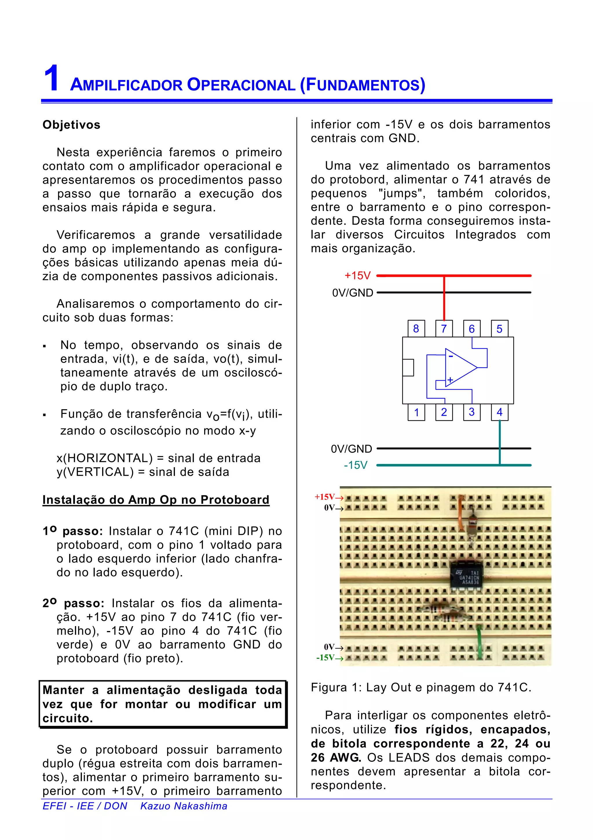 1) O documento apresenta 8 experimentos com amplificadores operacionais, descrevendo os circuitos, procedimentos e resultados esperados de cada um.