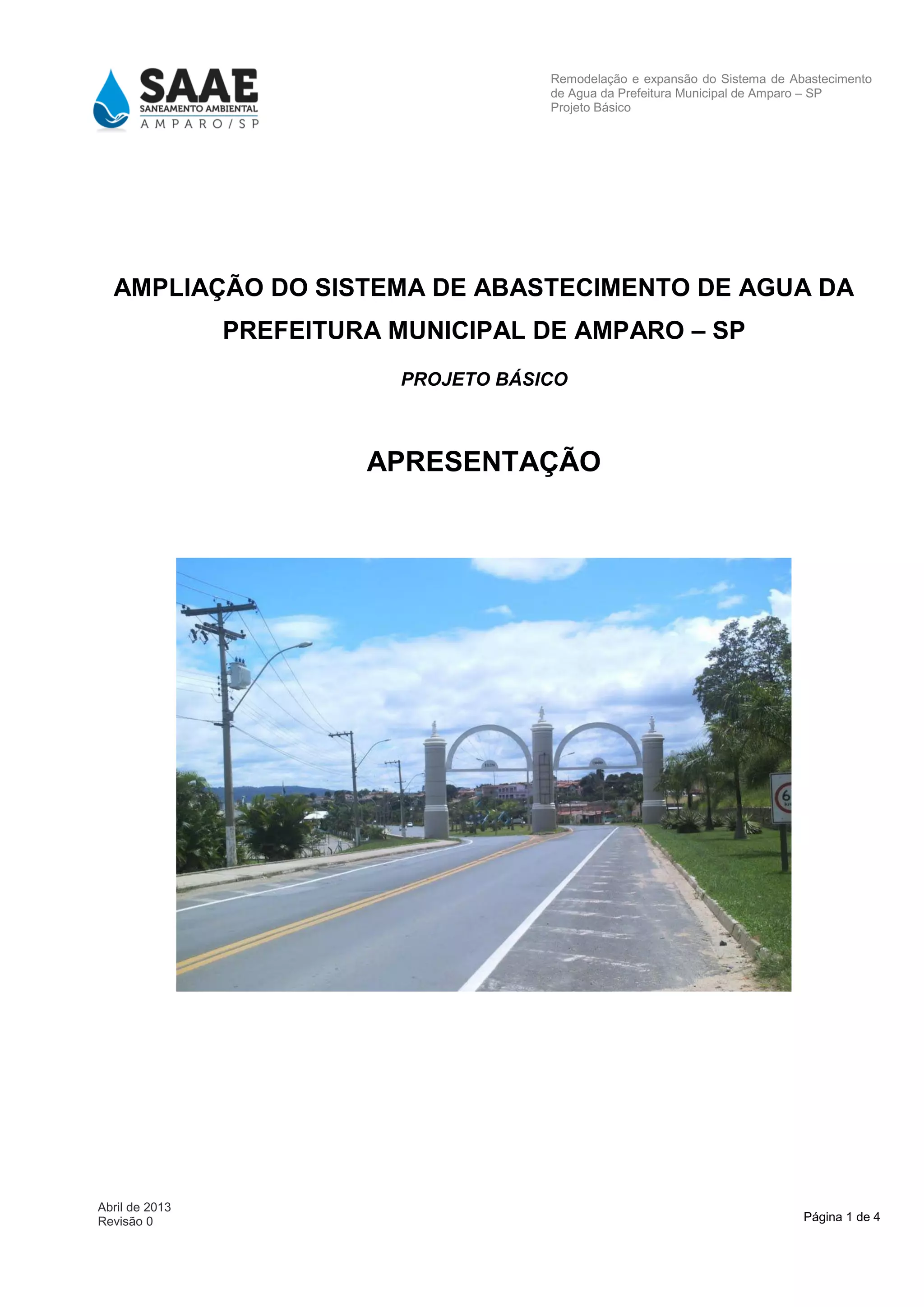 O documento apresenta um projeto básico para a ampliação do sistema de abastecimento de água do município de Amparo, SP. O projeto visa reabilitar e expandir os sistemas de captação, tratamento, armazenamento e distribuição de água para atender 100% da população de forma sustentável e equitativa.