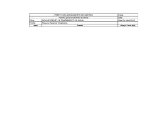 A planilha de orçamento para a nova Estação de Tratamento de Água em Amparo lista os itens e seus respectivos custos. Os principais itens são: Obras e Serviços por R$1.065.566,04; Nova Estação de Tratamento de Água por R$5.500.000,00; e Reservatório de 1000m3 por R$336.466,98, com o orçamento total sendo de R$11.888.500,00.