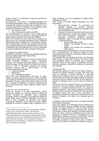 O documento apresenta um panorama da América Anglo-Saxônica, abordando seu quadro natural, geográfico e hidrografia, além de discutir a formação populacional e econômica dos Estados Unidos e Canadá, destacando a imigração e suas consequências sociais. Também descreve a geopolítica americana, suas intervenções e doutrinas ao longo da história, culminando na atual hegemonia dos EUA. Além disso, analisa a agropecuária e a indústria, destacando as características regionais e os cinturões agrícolas.