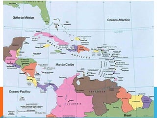 O documento descreve as características gerais e a regionalização da América Central. A América Central Continental é composta por 7 países entre o México e a América do Sul, com relevo montanhoso, clima tropical e problemas econômicos e sociais. A América Central Insular inclui ilhas como Cuba, Porto Rico e as Pequenas Antilhas, com economias frágeis baseadas na agricultura e turismo.