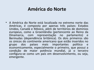 A América do Norte é composta por três países principais - Estados Unidos, Canadá e México - e possui uma variedade de relevos, hidrografia e climas que suportam diferentes tipos de vegetação, como florestas temperadas, estepe, pradaria e vegetação desértica.