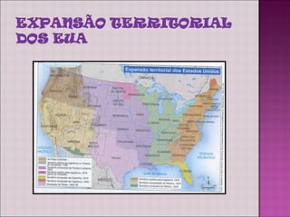 O documento resume a expansão territorial dos Estados Unidos através da compra de terras, tratados diplomáticos e guerras, como contra o México. Detalha como leis como o Homestead Act incentivaram a imigração e ocupação do oeste, apesar das tensões causadas entre os estados do norte e sul em torno da escravidão, levando à Guerra Civil.