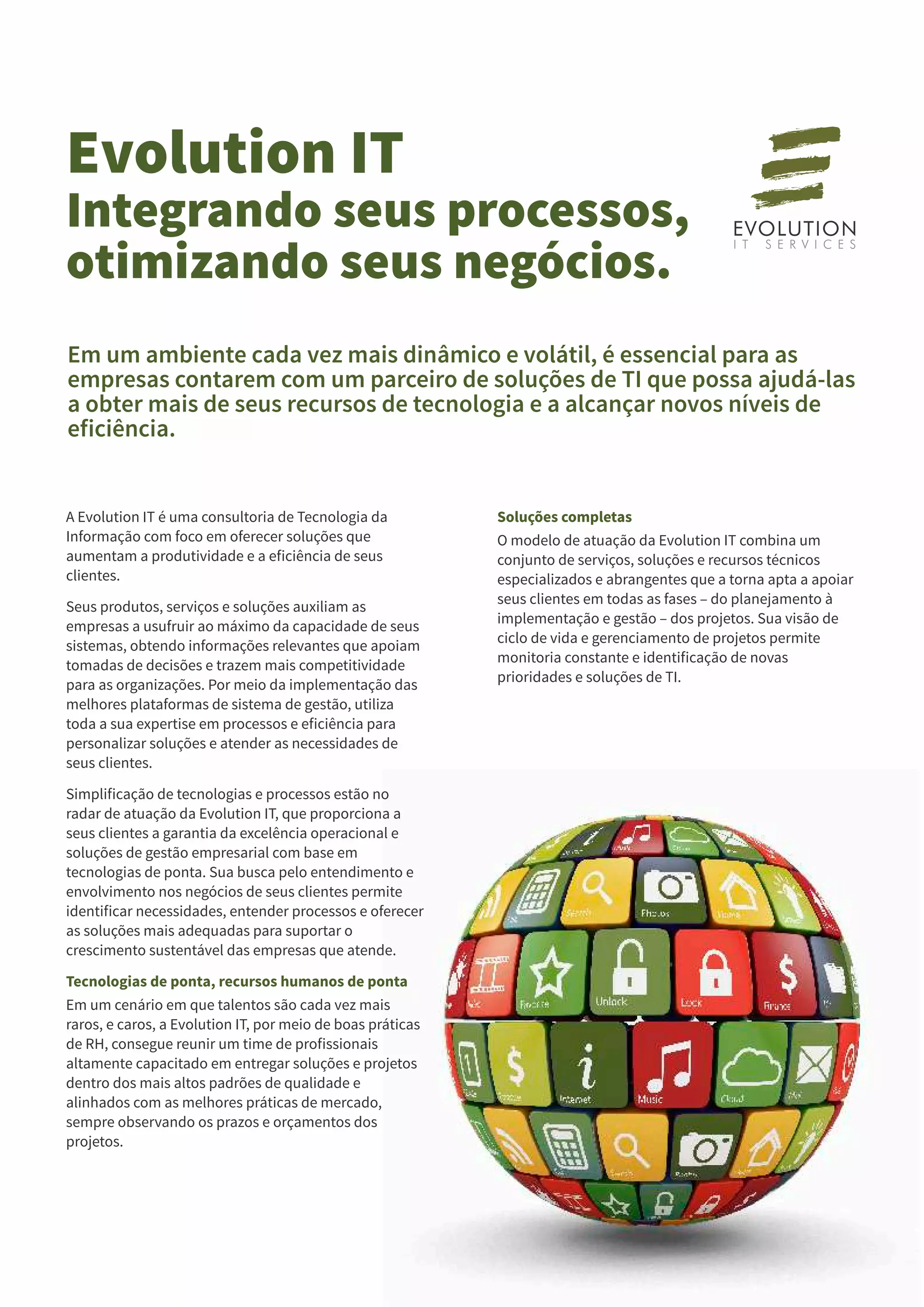 A Evolution IT é uma consultoria de TI que oferece soluções para aumentar a produtividade e eficiência dos clientes, integrando processos e otimizando negócios. A empresa auxilia clientes a obter mais valor de seus sistemas de TI e tomar melhores decisões, por meio de implementação de plataformas de gestão e soluções personalizadas. A Evolution IT também fornece serviços como desenvolvimento de software, business intelligence, mobilidade e alocação de profissionais.