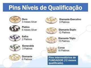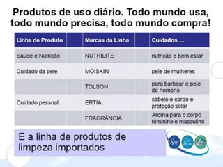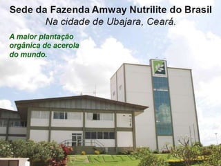 Este documento descreve a Amway, uma empresa de vendas diretas presente em mais de 80 países. A Amway faturou US$ 10,9 bilhões em 2011 e existe há mais de meio século. O documento explica como ganhar dinheiro na Amway através da revenda de produtos, formação de grupos e liderança. É possível ganhar de R$200 a R$10.000 dependendo do tamanho do grupo formado e da posição de liderança alcançada. Instruções sobre como se cadastrar na Amway também são fornecidas.