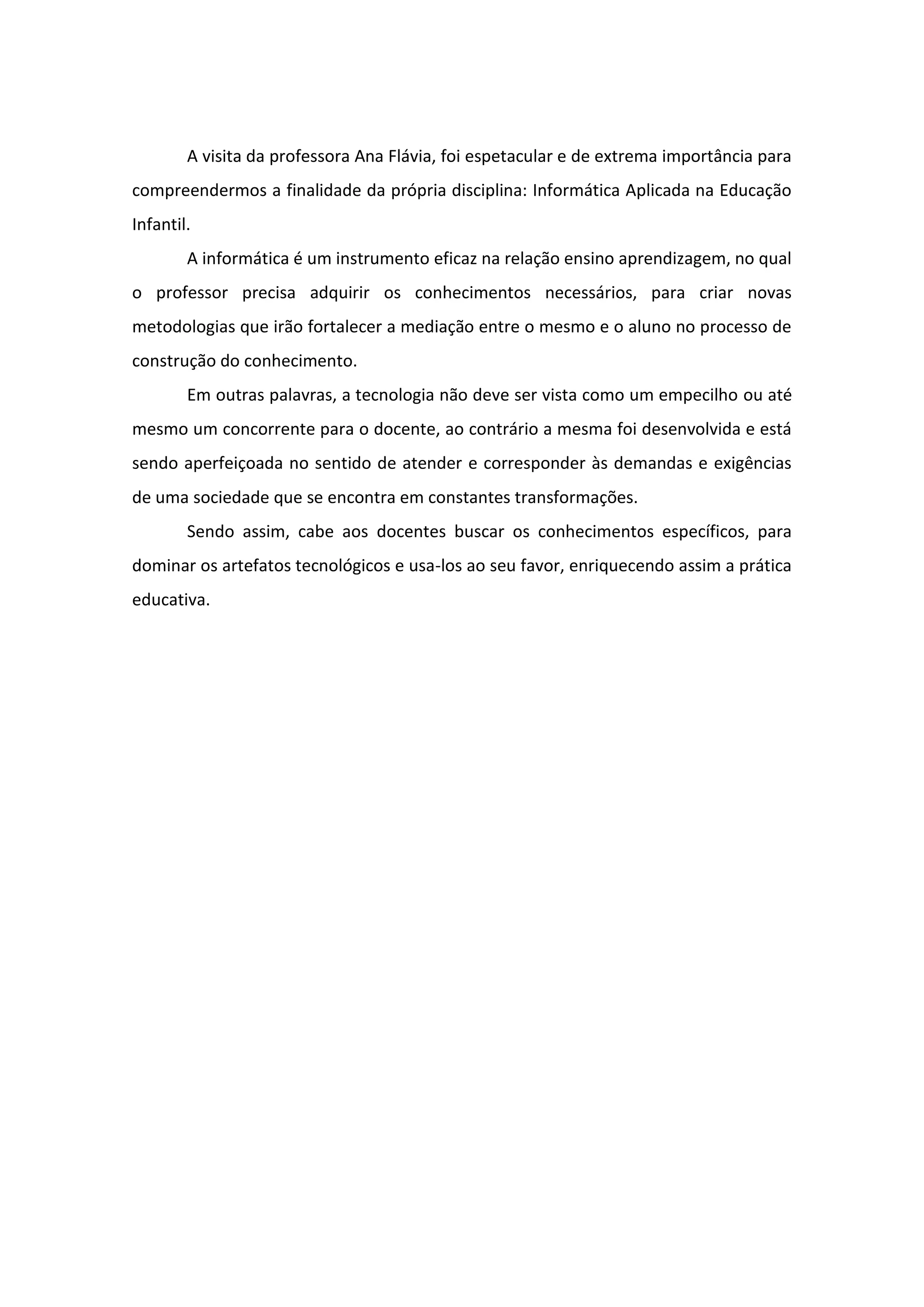 A visita da professora Ana Flávia destacou a importância da Informática Aplicada na Educação Infantil para compreender a disciplina e como a tecnologia pode fortalecer a relação ensino-aprendizagem quando usada corretamente pelos professores, que devem adquirir conhecimentos para criar novas metodologias.