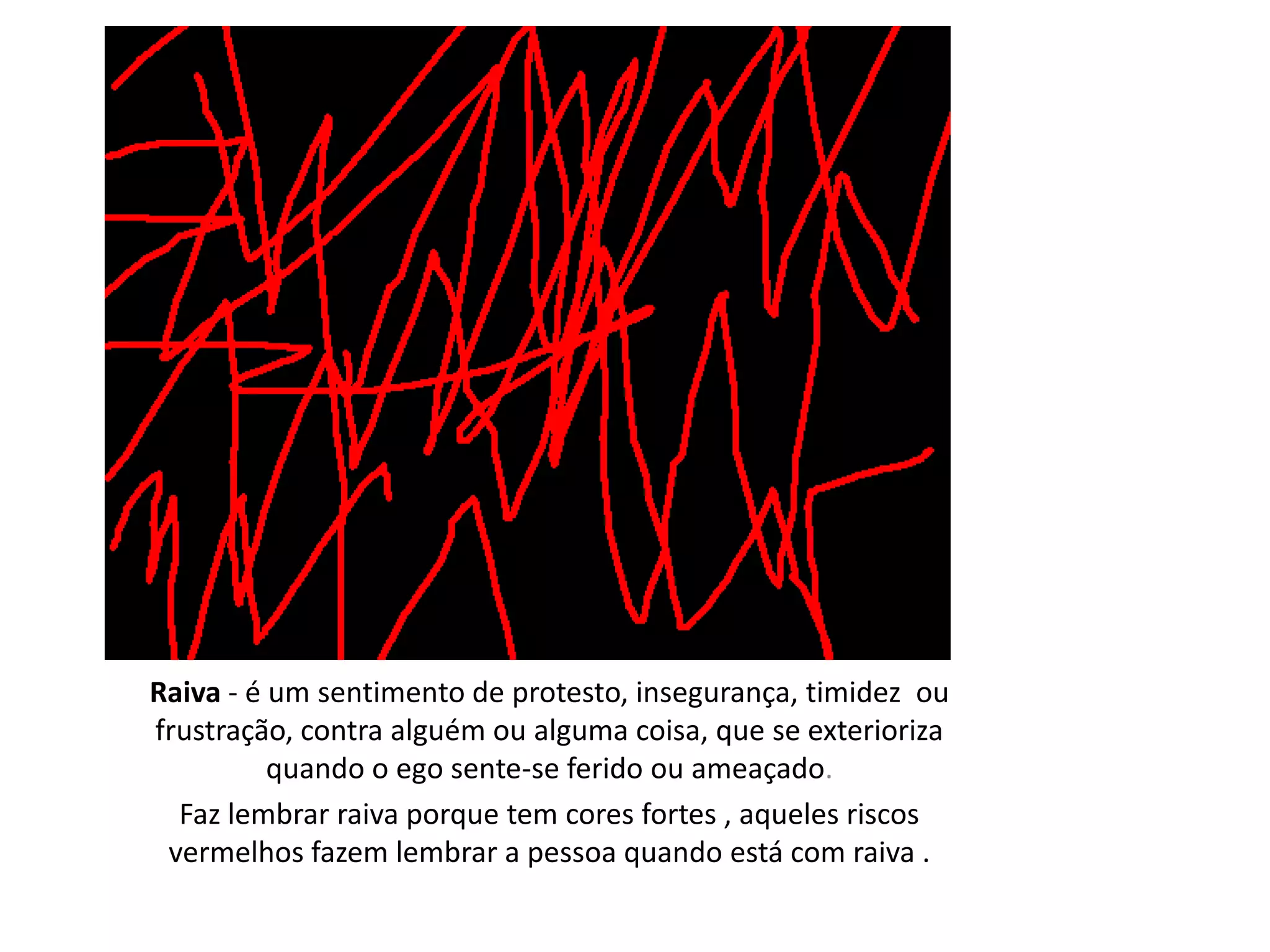 Raiva - éum sentimento de protesto, insegurança, timidez ou frustração, contra alguém ou alguma coisa, que se exterioriza quando o ego sente-se ferido ou ameaçado.Faz lembrar raiva porque tem cores fortes , aqueles riscos vermelhos fazem lembrar a pessoa quando está com raiva .