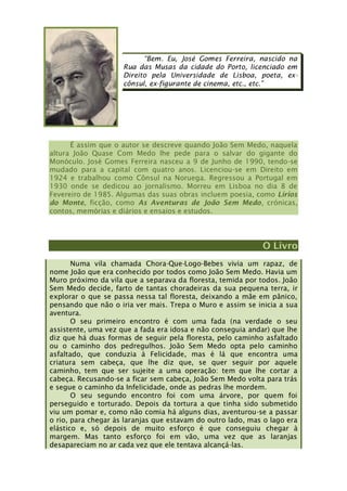 O documento resume o livro "As Aventuras de João Sem Medo" de José Gomes Ferreira. João Sem Medo é um rapaz que decide explorar a floresta perto de sua vila e passa por várias aventuras fantásticas, onde enfrenta criaturas mágicas e aprende valiosas lições. Cada capítulo transmite uma mensagem sobre a vida e a coragem de João Sem Medo.