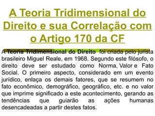 O documento discute a Teoria Tridimensional do Direito de Miguel Reale, que estuda o direito como Norma, Valor e Fato Social. Também analisa como a teoria se relaciona com o Artigo 170 da Constituição Federal, que reconhece os princípios da propriedade privada e função social da propriedade.