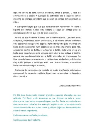 Este documento descreve uma unidade curricular sobre espaços, materiais e equipamentos em creches e jardins-de-infância. A unidade teve 25 horas e incluiu discussões sobre características de espaços internos e externos, bem como atividades individuais sobre higiene, receção de crianças e equipamentos. Os alunos desenvolveram e apresentaram planificações sobre higiene das mãos e dentes.